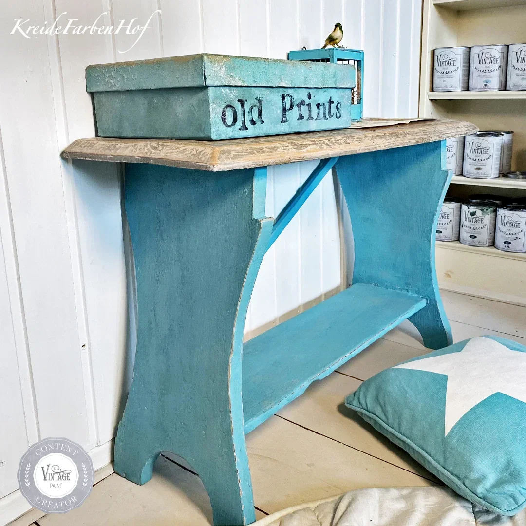 Kleursample-Vintage Paint-Old Turquoise- Wil je graag aan de slag met de minerale krijtverf van Vintage Paint maar twijfel je over de structuur en de kleur en vind je het moeilijk om een goede kleur keuze te maken?