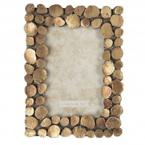 Goudkleurig bruinig rechthoekige fotolijst met een rand van houtblokjes in een bohemian stijl. Afmeting lijst 15x2x20 cm.