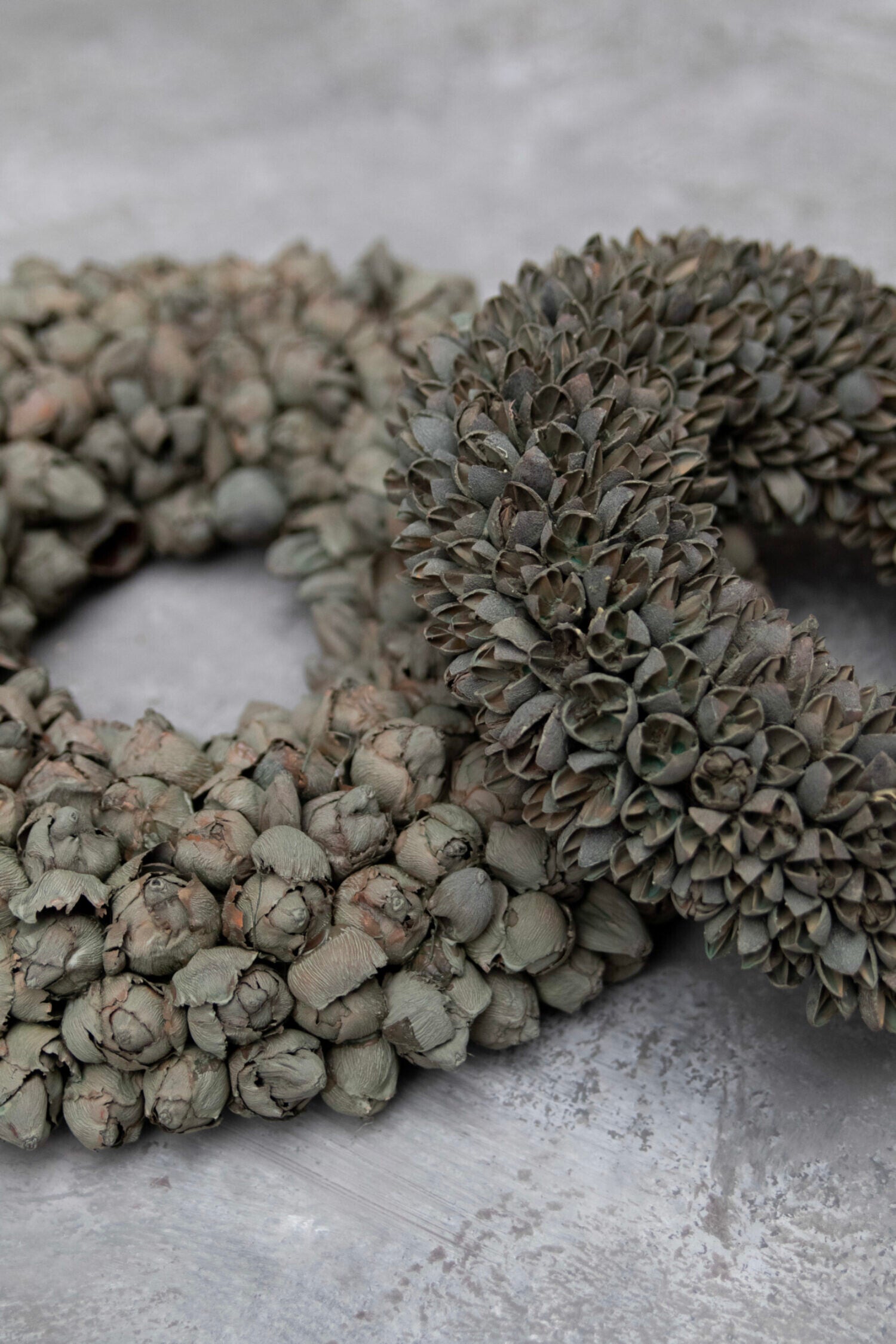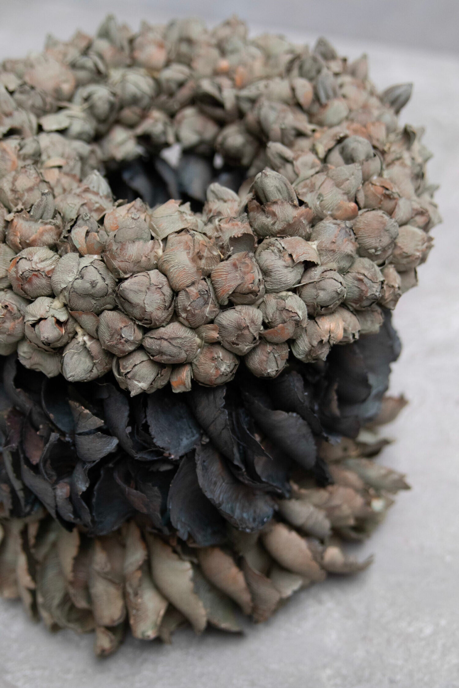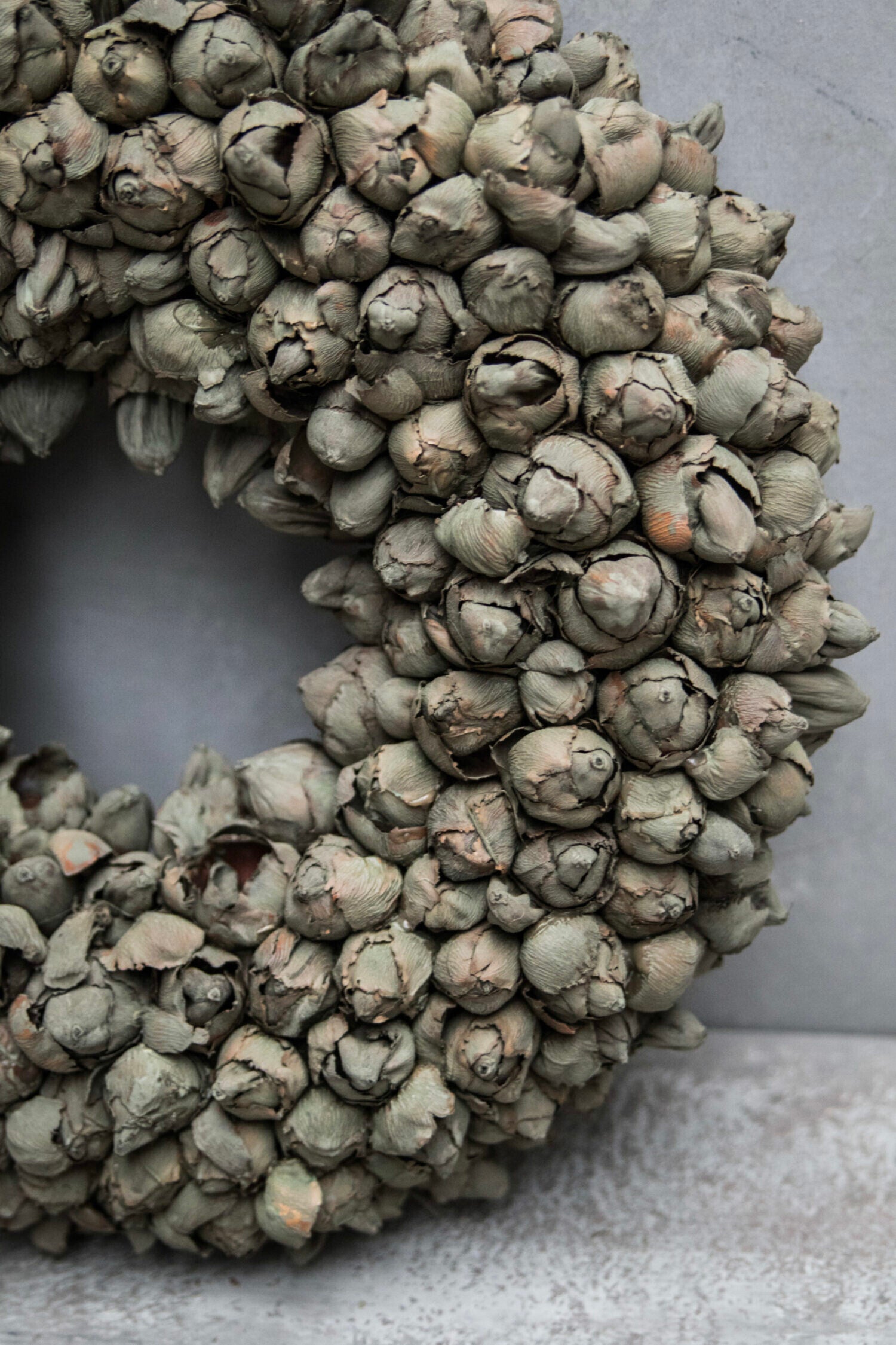 Charmante krans met gedroogd kokosfruit. Voor aan de muur, je deur of op een mooi schaaltje op tafel.