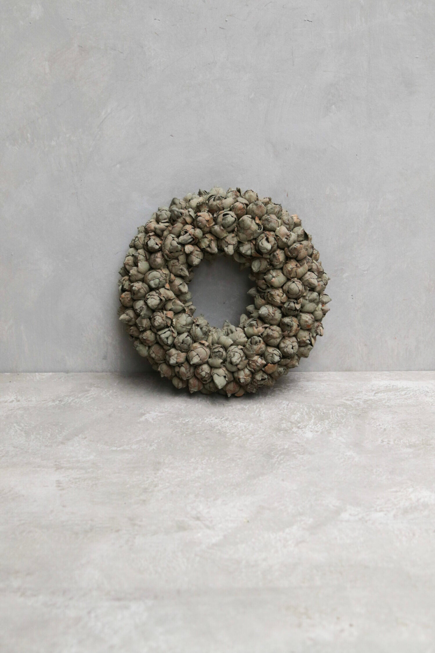 Charmante krans met gedroogd kokosfruit. Voor aan de muur, je deur of op een mooi schaaltje op tafel.