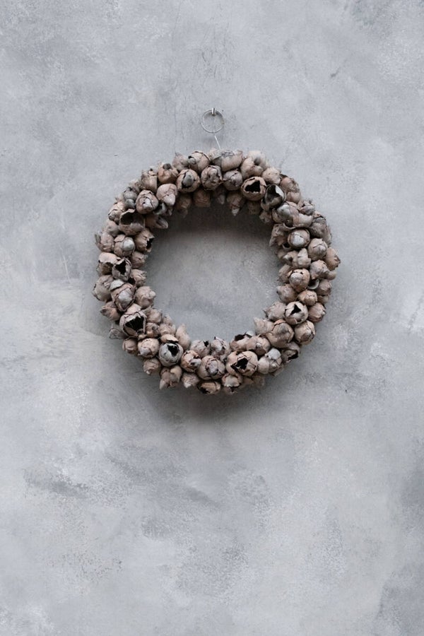 Charming wreath with dried coco fruit. For on the wall, your door or on a nice dish on the table.
